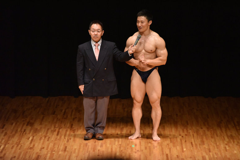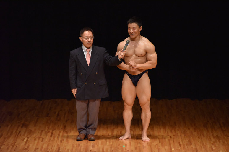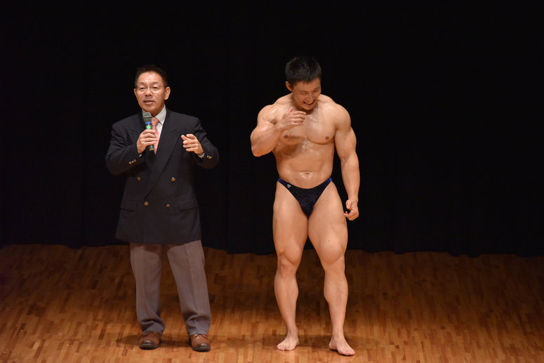 左は司会の木村和昭さん。(2013年中四国ボディビル選手権 総合優勝者)